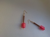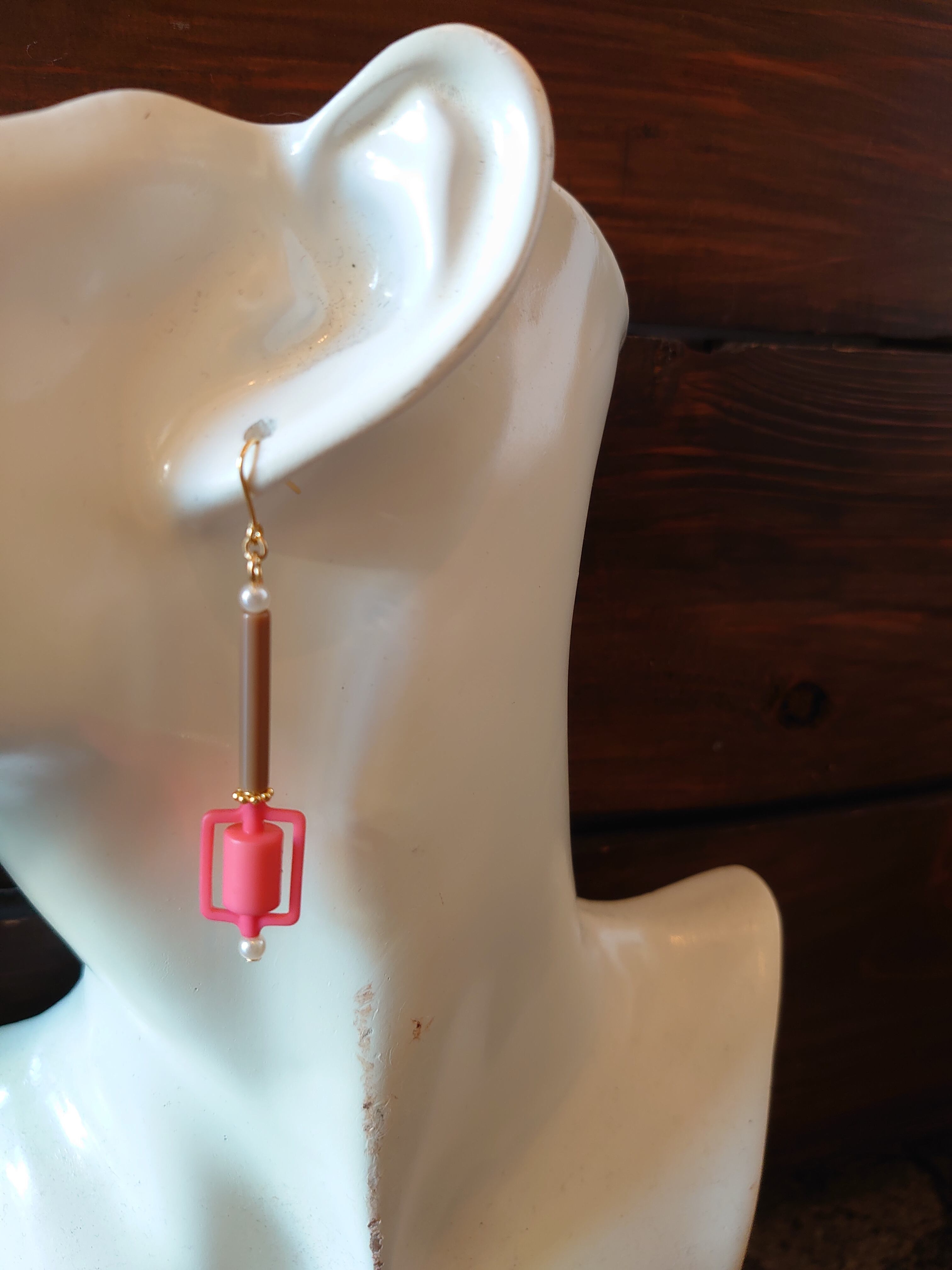 朱色のような面白い形状のビンテージビーズとビンテージパールなどを組み合わせたピアスです。