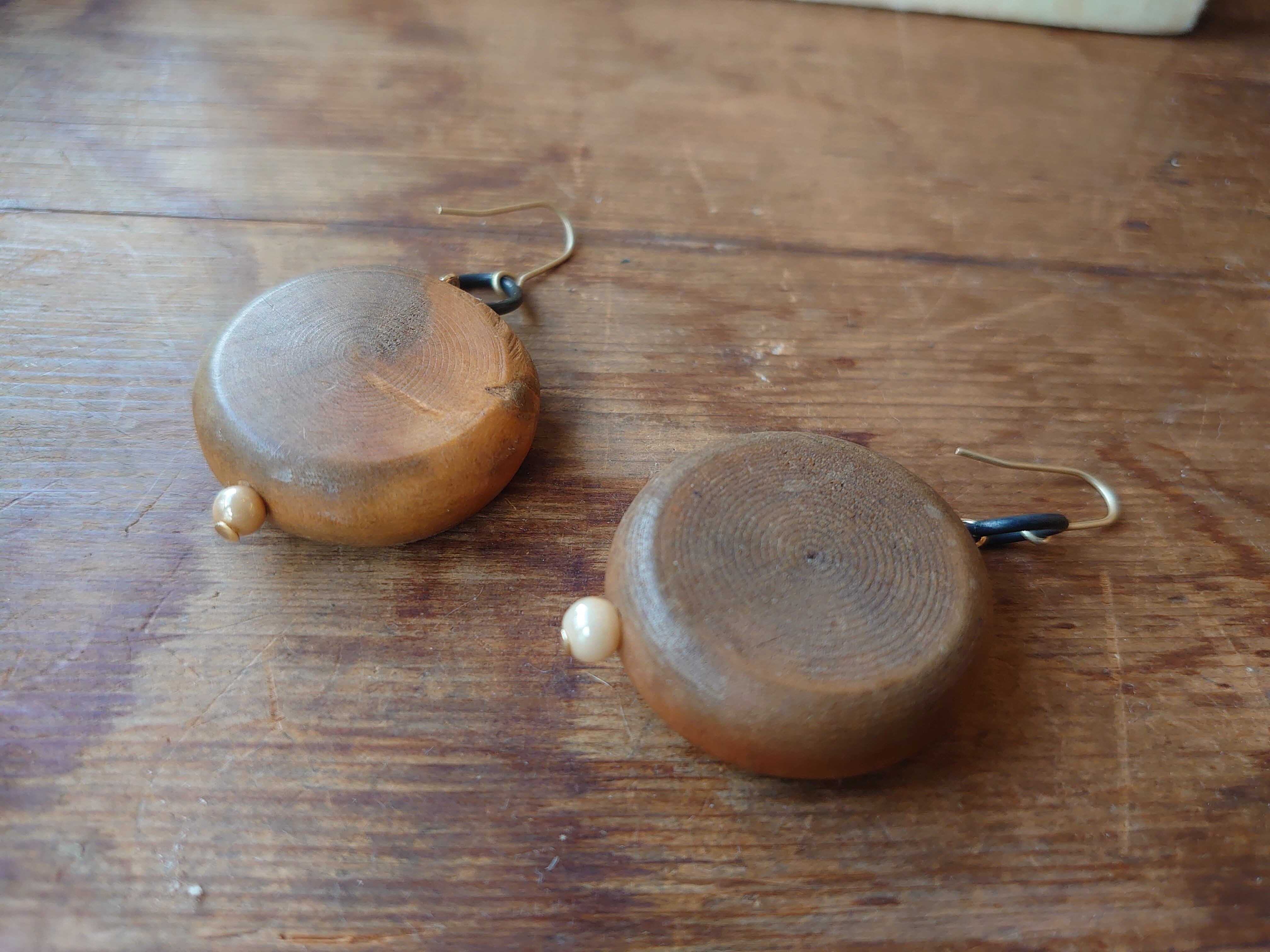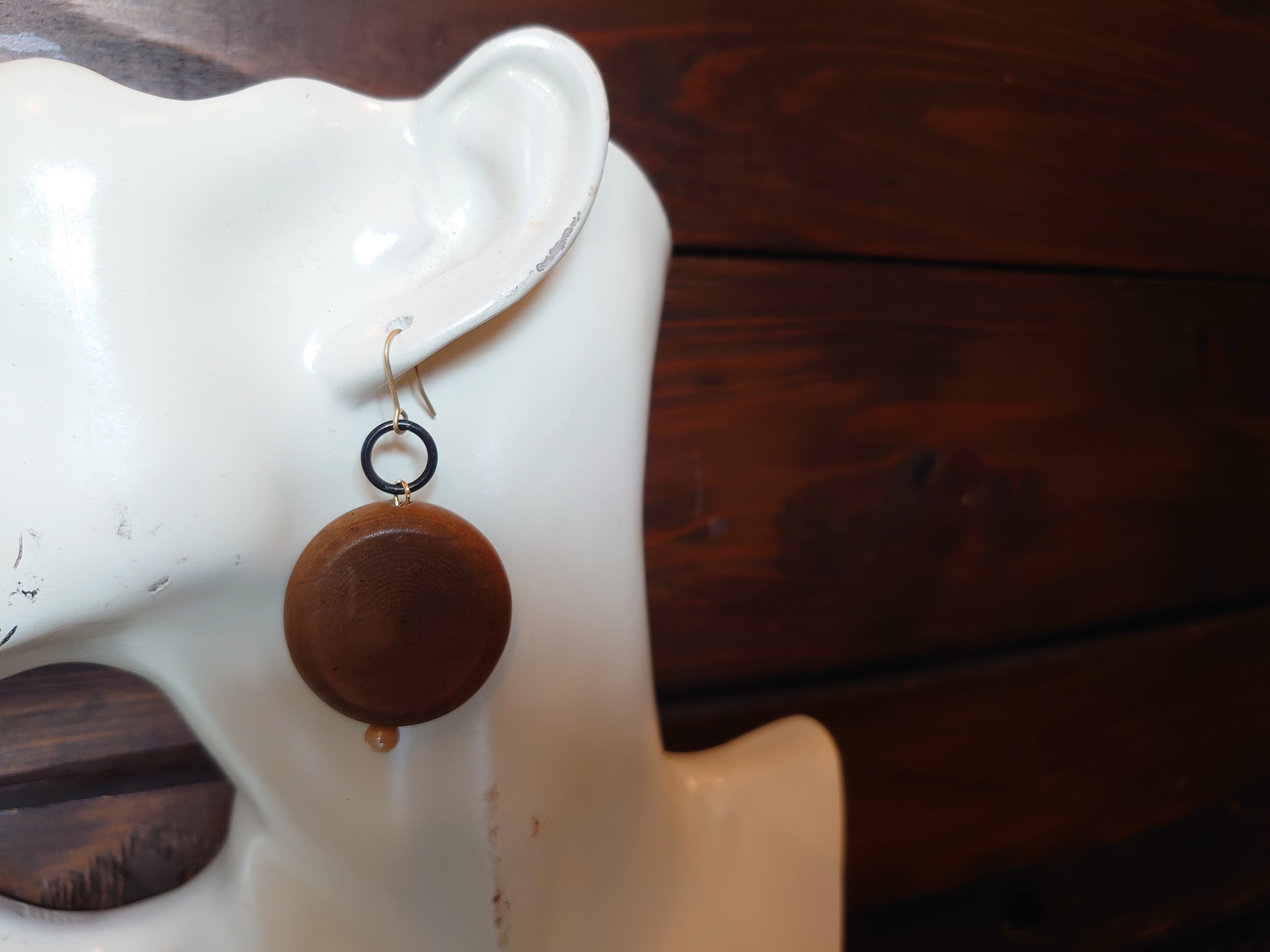 ビンテージシェルビーズとビスケットのようなウッドビーズを組み合わせています。